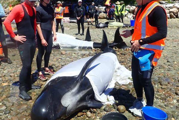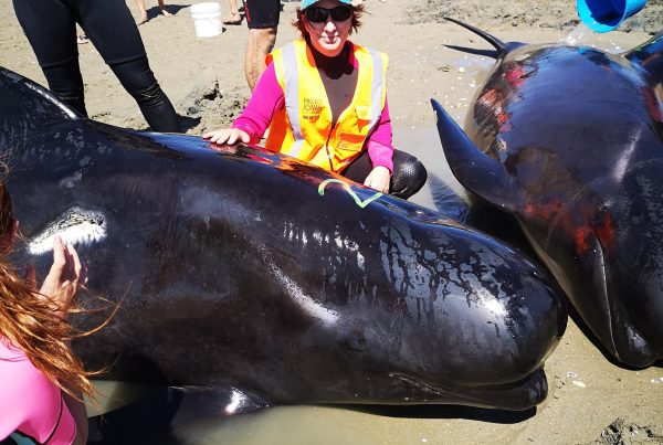 I trained in Nelson (where I live) last year and had not been to a stranding prior to this one. After receiving the text messages and heading over to Triangle Flat on Friday 13th, I arrived in time to catch the last bus ride out to the end of the spit after the initial stranding. Along with about 4 other Project Jonah volunteers, we arrived too late for that day but headed out into the water just as the whales were being released.